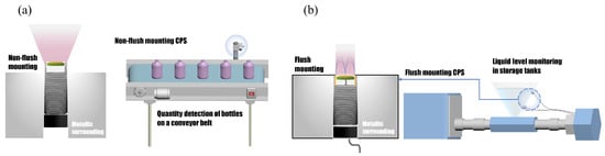 Capacitive sensors can be classified into two groups: floating capacitive sensors, in which neither of the electrodes is grounded, and grounded capacitive sensors, in which one of the two electrodes is grounded [6,7,8]. These two types of sensors are extensively applied in all kinds of fields. However, grounding one of the electrodes is necessary in some applications [9,10,11,12]. Grounded CPSs are susceptible to parasitic effects, stray capacitance, and distributed capacitance from the environment in practical environments, so shielding measures are often employed during their applications [13]. Furthermore, capacitive proximity switches face two types of operating conditions: flush mounting (FM) and non-flush mounting (NFM), due to different installation surfaces.