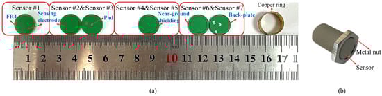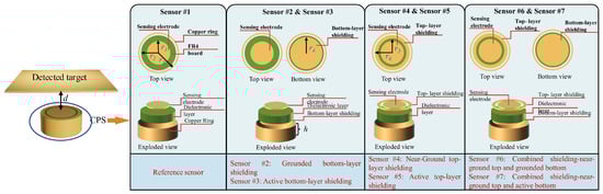 Figure 3 illustrates the seven sensor structures with various shielding modes. Each sensor consisted of a grounded copper ring and a printed circuit board (PCB) with a thickness of 1.6 mm. The sensing electrode and shielding electrode were respectively located on the top or bottom layer of the PCB. The PCB was embedded in the grounded copper ring, with its top layer flush with the edge of the ring. All the copper layers (sensing/shielding electrodes) had a thickness of 35 m. Table 1 provides the size of every component. The seven sensor structures differed primarily in the configuration of the shielding layer on the PCB, as detailed below.