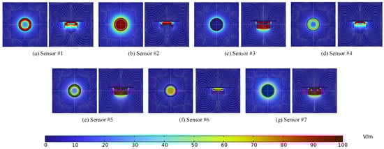 Figure 4 presents the electric field distributions of the seven sensor structures obtained through electrostatic and current field simulations. For the sensors without a shielding electrode on the bottom PCB (sensors #1, #4, and #5), the electric field intensity was concentrated between the sensing electrode and the ground plane. Adding a grounded shielding electrode to the bottom (sensors #2 and #6) concentrated the electric field, which reduced the induced electric field strength between the top sensing electrode and the ground plane, and consequently decreased the sensor sensitivity. With an active shielding electrode on the bottom (sensors #3 and #7), the electric field between the top and bottom electrodes was nearly zero. However, sensor #7, with an additional top grounded shielding electrode, experienced a capacitance effect between the top and bottom shielding electrodes, which was greater than the edge effect between the top shielding electrode and the sensing electrode. This resulted in a significant reduction in the sensor sensitivity. Sensor #6, with a coplanar grounded shielding electrode, completely isolated the sensing electrode from the ground plane, which led to a significant decrease in the sensor sensitivity.