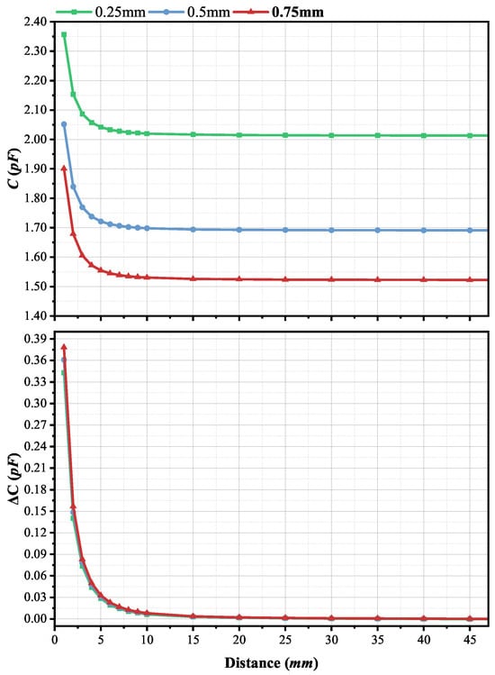where is the capacitance value of the sensor with the target at a distance of 45 mm. When the distance variation is constant, the sensitivity change S of the sensor exhibits a linear relationship with the capacitance variation . Therefore, can be used as a quantitative measure of the sensor’s sensitivity.