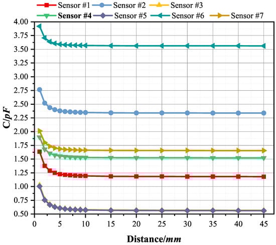 Furthermore, we conducted a parametric sweep of the measurement distance to quantitatively analyze the capacitance and sensitivity of different sensor structures. The measurement distance started from 1 mm and increased in 1 mm increments to 10 mm, followed by 5 mm increments to 45 mm. Figure 6 shows the curves of the ground capacitance of each sensor as a function of the measurement distance. The capacitance values of the sensors decreased as the distance between the sensors and the target increased. Compared with the reference sensor (sensor #1), sensors #2, #4, #6, and #7 possessed larger capacitance values due to the extension of area in the grounded electrode. When the target was at a distance of 1 mm from the sensor, the capacitance variation of sensor #1 was about 450 fF, and sensors #2, #4, #6, and #7 diminished the capacitance variation to different extents, meaning lower sensitivities. Sensors #3 and #5 decreased the capacitance values by about 600 fF and keep the capacitance variation close to that of sensor #1.