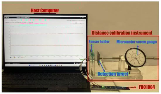 Figure 7a presents the physical prototypes of the seven CPS sensors. Each sensor consisted of a PCB electrode plate and a copper ring, which were encapsulated in plastic housing for convenient installation and testing. The specific dimensions of each component were same as the sizes in Table 1. The design adhered to IPC-6012 Class 2 standards for commercial PCBs, requiring no precision beyond conventional manufacturing capabilities. This ensured immediate scalability for industrial production. To precisely control the distance between the target and the sensor surface, a custom distance calibration instrument was designed. As shown in Figure 8, this instrument consisted of a sensor holder, a micrometer with a screw, and a 50 mm × 50 mm × 0.5 mm square copper plate that served as the detection target. The micrometer had a measurement range of 50 mm, with an accuracy of 1 mm. By rotating the micrometer, the distance between the copper plate and the sensor could be accurately recreated and maintained.