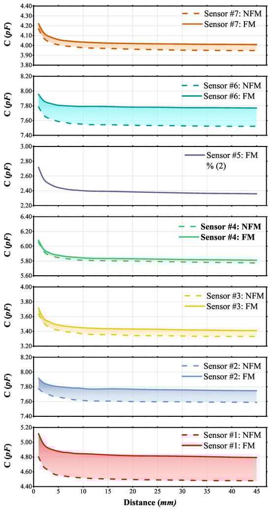 Figure 11b shows the relative capacitance variation of seven sensors as a function of the target distance under the FM and NFM conditions. Compared with sensor #1, the responses of sensors #2, #3, #4, #6, and #7 were lower, while the value of sensor #5 increased to 15%. Additionally, for sensors #4 and #5, the two curves almost overlapped.
