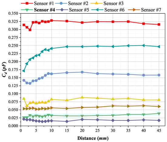 The of the seven sensors at various target distances (1–45 mm) is presented in Figure 10. The average for each sensor is summarized in Table 2. As the target approached, the of all sensors decreased. Sensor #1, the reference sensor, exhibited the highest (approximately 320 fF), indicating a significant sensitivity to the installation methods. Sensor #2, with a grounded shielding electrode, reduced by 53.1% compared with the reference. Sensor #3, which employed an active shielding electrode, further reduced by 76.6%. Sensor #4, with a near-ground shielding electrode on the top layer of the PCB, significantly reduced by 90.6%. Sensor #5, using an active shielding electrode on the top layer of PCB, achieved the lowest (17 fF) but may be more complex and costly. Sensor #6, which combined NG shielding on the top PCB and grounded shielding on the bottom, reduced by 28.4%. Sensor #7, which combined near-ground and active shielding, reduced by 82.5%.