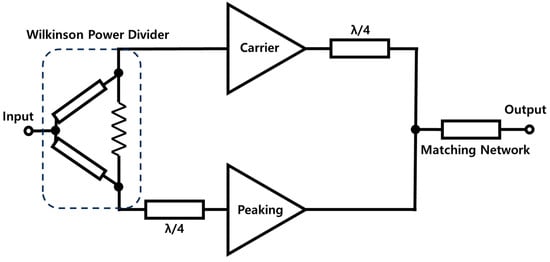The proposed DPA was designed as a multi-band PA using 6 W GaN on SiC HEMT devices (Qorvo TGF2965-SM, Greensboro, NC, USA) [17]. A schematic of the entire DPA design is illustrated in Figure 7. The topologies for the carrier and peaking amplifiers were identical, except for their bias conditions. The carrier amplifier was biased in class AB mode, while the peaking amplifier operated in class C mode.