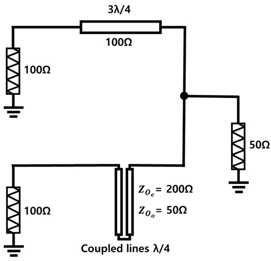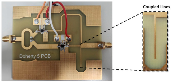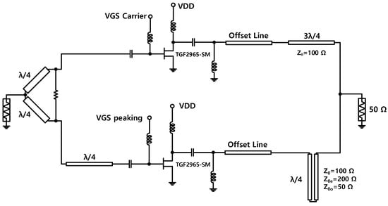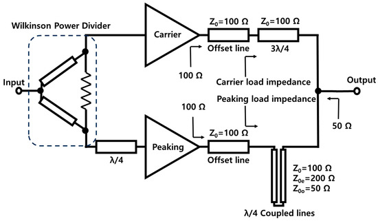 A Wilkinson power divider, a carrier amplifier, and a peaking amplifier were designed to have broadband characteristics that cover all three operating frequencies. Offset lines were introduced in the output path to provide an open circuit condition for the peaking amplifier and compensation for the phase difference between the two paths [15]. The outputs of the carrier and the peaking amplifiers were matched at 100 Ω. The characteristic impedance of the uniform transmission line was 100 Ω. The characteristic impedance of the coupled lines was 100 Ω with of 200 Ω and of 50 Ω. Both transmission lines, each with a characteristic impedance of 100 Ω, enabled a parallel connection of the carrier and peaking amplifiers in the high-power region. This parallel combination effectively transformed the two 100 Ω impedances at the amplifier outputs into a 50 Ω load.