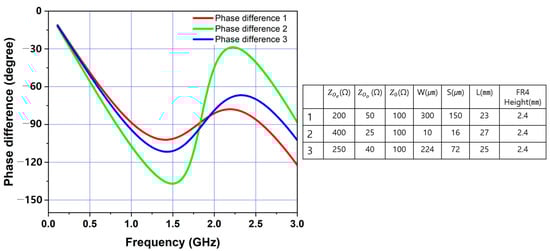 Figure 3 presents the phase difference responses of the Schiffman phase shifter across a frequency range of 0 to 3 GHz for three different configurations. The substrate was FR-4 with a 2.4 mm height and εr of 4.2. Each configuration was characterized by unique even-mode and odd-mode impedances, with the corresponding geometrical parameters listed in the table. The red, green, and blue curves represent phase difference 1, 2, and 3, respectively. Each trace exhibited three distinct frequency points where a 90° phase shift was achieved. Phase difference 1 (red curve): with = 200 Ω and = 50 Ω, the 90° phase difference occurred at approximately 1 GHz, 1.8 GHz, and 2.6 GHz. Green curve: for = 400 Ω and = 25 Ω, 90° crossings were observed at around 0.8 GHz, 1.8 GHz, and 3 GHz, showing a steeper and more frequency-sensitive behavior. Blue curve: with = 250 Ω and = 40 Ω, a 90° phase shift was achieved at approximately 0.9 GHz, 1.8 GHz, and 2.8 GHz. Among the three configurations, Trace 1 (red) demonstrated the most suitable performance for our design goals, as it effectively covered the low band (LB), mid band (MB), and high band (HB) frequency ranges. Additionally, its impedance and geometry values were well within the practical limits of standard PCB fabrication processes (minimum trace width and spacing of 150 μm), making it a more reliable and manufacturable solution.