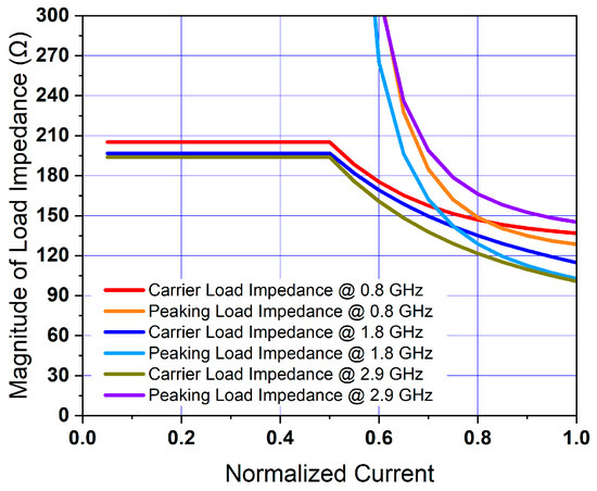 Figure 6 illustrates the simulated variation in the magnitude of load impedances as a function of normalized currents for both the carrier and peaking paths in the proposed Doherty power amplifier [16]. At low normalized current levels (below 0.5), the carrier amplifier dominated the operation, and the peaking amplifier remained inactive, resulting in a constant carrier load impedance of about 200 Ω (twice of the matching impedance 100 Ω). As the normalized current increased beyond this threshold, the peaking amplifier became active, causing a rapid drop in the peaking load impedance due to load modulation. This behavior was essential to the Doherty architecture, enabling efficiency enhancement at back-off power levels. Figure 6 shows the representative load modulation at 0.8 GHz, 1.8 GHz, and 2.9 GHz, where the load modulation seemed assured among near frequencies.