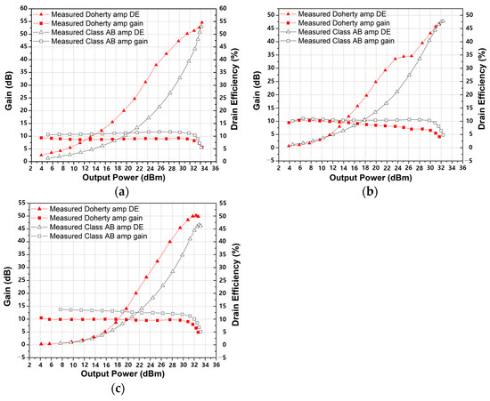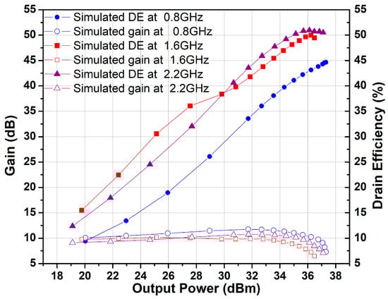The post-layout electromagnetic (EM) simulation results of the power amplifier (PA) are shown in Figure 8. We applied 20 V for the drain, because the minimum valid drain voltage of the transistor model was 20 V. The simulated drain efficiency and gain versus output power within the frequency ranges of LB 0.8 GHz, MB 1.6 GHz, and HB 2.2 GHz are depicted. The proposed DPA achieved drain efficiencies at a saturation of 45% for LB, 50% for MB, and 50% for HB. We achieved gains of around 10 dB for each band. The gate bias voltage for the carrier amplifier was set to −2.5 V to obtain a quiescent current of 40 mA, while the gate bias voltage for the peaking amplifier was set to −3.7 V with no current consumption. The simulation results indicate that the saturated output power () reached 37 dBm, 36 dBm, and 37 dBm for the low band, mid band, and high band, respectively.