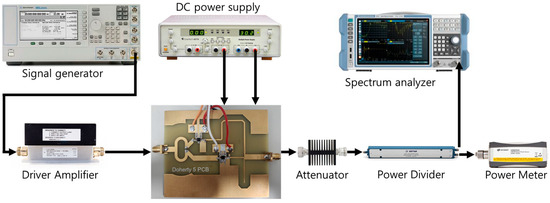 A signal generator was used to generate the required input signal, and a driver amplifier was placed between the signal generator and the fabricated DPA to amplify the input power. A spectrum analyzer and a power meter were utilized to monitor the output signal, with an attenuator inserted before it, as shown in Figure 10.