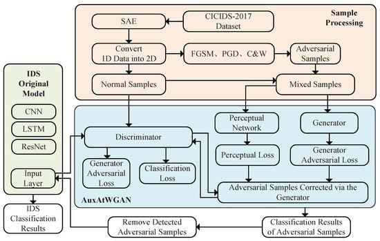 To improve the robustness of intrusion detection systems constructed using deep learning models, a method based on an auxiliary adversarial training WGAN (AuxAtWGAN) is proposed from the defender’s perspective. First, one-dimensional traffic data are downscaled and processed into two-dimensional image data via a stacked autoencoder (SAE), and mixed adversarial samples are generated using the fast gradient sign method (FGSM), Projected Gradient Descent (PGD) and Carlini and Wagner (C&W) adversarial attacks. Second, the improved WGAN with an integrated perceptual network module is trained with mixed training samples composed of mixed adversarial samples and normal samples. Finally, the adversary-trained AuxAtWGAN model is attached to the original model for adversary sample detection, and the detected adversary samples are removed and input into the original model to improve the robustness of the original model. The average attack success rate of the original convolutional neural network (CNN) model against multiple adversarial samples is 75.17%, and after using AuxAtWGAN, the average attack success rate of the adversarial attacks decreases to 27.56%; moreover, the detection accuracy of the original CNN model against normal samples is still 93.57%. The experiment proves that AuxAtWGAN improves the robustness of the original model. In addition, validation experiments are conducted by attaching the AuxAtWGAN model to the Long Short-Term Memory Network (LSTM) and Residual Network34 (ResNet) models, which prove that the proposed method has high generalization performance.
