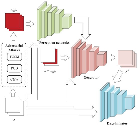 In the study of auxiliary models, many studies have focused on auxiliary model defense methods that are based on GANs. Samangouei et al. built upon the GAN framework and proposed a defense method named DefenseGAN, which learned the original sample distribution by training the generator, searched for original images close to the adversarial samples in the testing phase, and transformed the adversarial samples into normal samples to reduce the effect of adversarial noise []. Shen et al. also proposed a defense method called APEGAN based on a GAN, where a CNN generator was used to design a mapping function to make the adversarial samples turn back to clean samples, a discriminator was responsible for distinguishing between the real clean samples and the recovered samples, and iterative adversarial training via the GAN was carried out to better the recovery effect []. Wang et al. proposed a defense method named ATGAN based on APEGAN by adjusting and optimizing the flow direction of the data and designing a perceptual network used to assist in improving the generation quality of the generator [].
