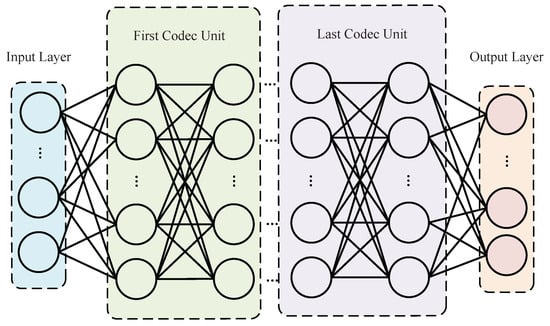 where h is the output of the encoder, x represents the original input data, represents the sigmoid activation function, and and represent the weights and biases of the encoder, respectively. The goal is to minimize the reconstruction loss as follows: