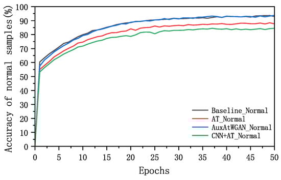 In Figure 13, the experimental results show that the classification accuracy for normal samples was almost unaffected. The accuracies of LSTM+AuxAtWGAN and LSTM on normal samples were 93.52% and 93.46%, respectively, and those of ResNet34+AuxAtWGAN and ResNet34 reached 89.71% and 90.18%, respectively. This showed that AuxAtWGAN, as an auxiliary module, did not affect the original model’s ability to classify normal samples, and its introduction did not degrade the original performance of the model.