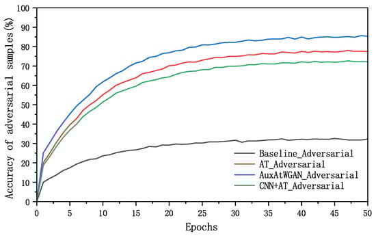 In Figure 12, the experimental results show that the detection rate of the completely unguarded baseline method for adversarial samples was very low, while the AT and CNN+AT methods after adversarial training significantly improved the defense ability of the adversarial samples, and compared with the method with adversarial training, the AuxAtWGAN method with the WGAN and perceptual network augmentation achieved a certain improvement in terms of the defense effect. A comparison of the accuracies of the baseline, AT, CNN+AT, and AuxAtWGAN methods for normal and adversarial samples is shown in Table 2.