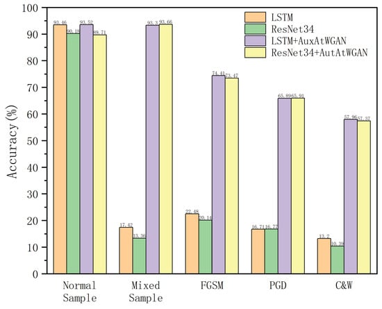 The generalizability of the AuxAtWGAN method was assessed by evaluating its defense effectiveness against that of LSTM and ResNet34 models using five types of input samples: normal samples, mixed samples, FGSM, PGD, and C&W adversarial samples. The experiments were conducted using four models, namely, LSTM, ResNet34, LSTM+AuxAtWGAN and ResNet34+AuxAtWGAN. The normal sample set evaluated the original model’s classification performance on non-attacked samples, while the hybrid sample set, comprising FGSM, PGD, and C&W adversarial samples, assessed the model’s robustness. The FGSM, PGD, and C&W adversarial samples, each representing distinct attack modes, were utilized to evaluate the model’s defense capabilities. The experiment used accuracy to assess model performance across different sample types. Figure 13 presents the experimental results.