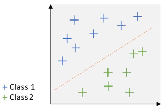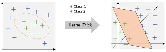 Support vector machine [] is a supervised learning algorithm widely used for both classification and regression tasks. The fundamental principle of SVM lies in identifying an optimal hyperplane that separates data points belonging to different classes while maximizing the margin between them. In two-dimensional space, this hyperplane manifests as a straight line, whereas, in higher-dimensional spaces, it generalizes to a hyperplane. The primary objective of SVM is to maximize this margin, thereby ensuring robust classification performance [,]. Given a set of training data, where each data point is associated with a class label, the primary goal is to identify a hyperplane that separates data points belonging to different classes. For linearly separable data, a hyperplane exists that can perfectly classify the data points, as illustrated in the SVM classification shown in Figure 1 for linearly separable data. The objective in this scenario is to determine the optimal hyperplane that maximizes the margin between the classes, thereby improving classification performance. In contrast, when the data are linearly non-separable, meaning no hyperplane can perfectly separate data points from different classes, a method called the “Kernel Trick” can be applied. This approach maps the original data into a higher-dimensional feature space, where the data becomes linearly separable. By applying this transformation, a hyperplane can be identified in the transformed space to achieve effective separation, as illustrated in Figure 2 SVM with kernel trick for nonlinearly separable data. The choice of kernel function, such as polynomial or radial basis function (RBF), plays a crucial role in determining the success of this transformation and subsequent classification accuracy.
