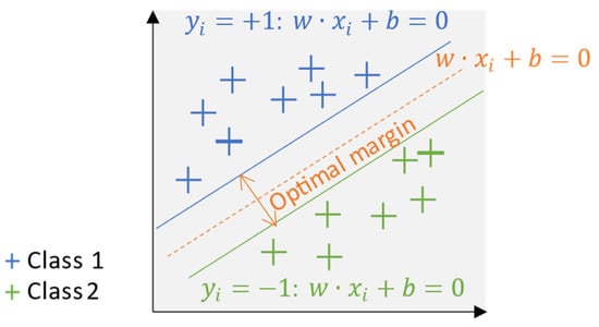 Figure 3 visually illustrates the fundamental concepts and mathematical principles underlying SVM, including classification margin, hyperplane, and mathematical description. Given a set of training data , , …, , where represents a feature vector, and represents the class label. The objective of SVM is to find an optimal hyperplane, , that correctly separates data points of different classes and maximizes the margin between them. To achieve this, SVM enforces the following condition for all i, as shown in Equation (1):
