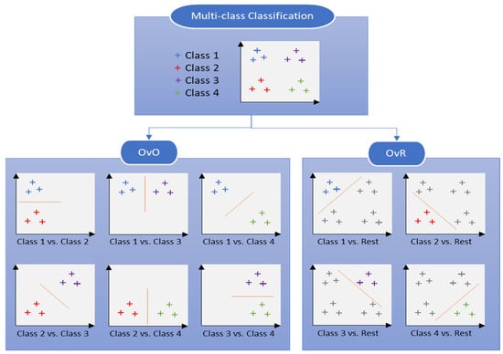 Although SVM is inherently a binary classifier, it can be extended to multi-class classification using different strategies. Figure 4 illustrates two common strategies, including One-vs-One (OvO) and One-vs-Rest (OvR). In the OvO strategy, the problem is divided into multiple binary classification tasks, with the number of tasks calculated as shown in Equation (9):