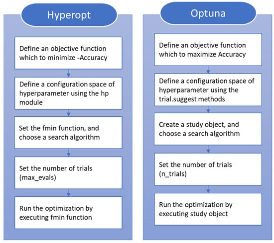 Hyperopt and Optuna are Python(3.9.15)-based libraries specifically designed for hyperparameter optimization. Their primary goal is to identify the optimal values of an objective function within a defined hyperparameter space, while a function of both is the ability to configure a database to store all point evaluations during the search process. Hyperopt supports algorithms such as Random Search, TPE, and Adaptive TPE. In contrast, Optuna offers a broader range of samplers, including RandomSampler, GridSampler, TPESampler, CmaEsSampler, NSGAIISampler, QMCSampler, GPSampler, BoTorchSampler, and BruteForceSampler. Figure 5 describes the workflow for using Hyperopt and Optuna to optimize hyperparameters, which comprises the following five steps: The first step is to define an objective function. In Hyperopt, the objective function must be minimized, as the library supports only minimization. To maximize metrics such as accuracy, the function must return a negative value as -Accuracy. Optuna, on the other hand, supports both minimization and maximization directly, allowing accuracy to be returned without transformation. The second step is to define a configuration space. Hyperopt’s configuration space is defined using the hp module, such as hp.uniform and hp.choice. Optuna defines its configuration space using trial.suggest_* methods, such as trial.suggest_float and trial.suggest_int. The third step is to select a search algorithm. Hyperopt uses the fmin function to execute the optimization, and users can select algorithms like TPE or Random Search. Optuna initializes a study object with TPE as the default sampler but also supports other samplers, such as RandomSampler, GridSampler, and CmaEsSampler. The fourth step is to set the number of trials. In Hyperopt, the maximum number of iterations is specified using the max_evals parameter. In Optuna, the equivalent parameter is n_trials. The final step is to run the optimization, and the optimization process in Hyperopt is executed using the fmin function, while Optuna uses the study.optimize method. In summary, Hyperopt offers a straightforward approach, supporting only minimization and a limited set of algorithms, whereas Optuna provides greater flexibility by accommodating a wider range of algorithms and supporting both maximization and minimization.