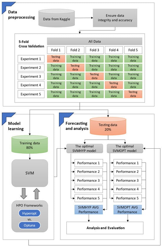In this study, the multi-class classification forecasting method support vector machines with hyperparameter optimization frameworks was proposed to predict mobile phone prices. Figure 6 illustrates the proposed architecture for predicting mobile phone prices, which is described through the following stages. In the data preprocessing stage, the mobile phone dataset is obtained from Kaggle [], and subsequently the completeness and accuracy of dataset are verified. The dataset is then split using 5-fold cross-validation [,], with 80% allocated for training and 20% reserved for testing. In the model learning stage, the training data are used to train the SVM model, incorporating hyperparameter optimization with two HPO frameworks, Hyperopt and Optuna, to identify the most optimal model. In the forecasting and analysis stage, the test data are fed into the optimized models to generate predictions for each experimental subset. Finally, the predicted results are analyzed and evaluated based on the average performance across the five cross-validation folds. The overall procedure for mobile phone price classification using the proposed SVM-based framework with hyperparameter optimization is summarized in Algorithm 1. This algorithm incorporates data preprocessing, 5-fold cross-validation, and the application of two HPO methods to determine hyperparameters. The details are provided as follows:
