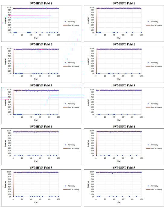 Two advanced HPO frameworks, Hyperopt [,] and Optuna [], have been widely and successfully applied in optimizing machine learning and deep learning models across various domains. In this study, the effectiveness of applying advanced HPO frameworks to multi-class SVM models was investigated. Recent studies have explored the use of Hyperopt [] and Optuna [,] in multi-class SVM applications. However, the related investigations are relatively limited in the current literature, highlighting both the novelty and practical relevance of this study. This study addresses the gap by leveraging Optuna and Hyperopt in a multi-class classification context. In addition, the cross-validation was conducted in this study to demonstrate the generalizability and robustness of classification results.