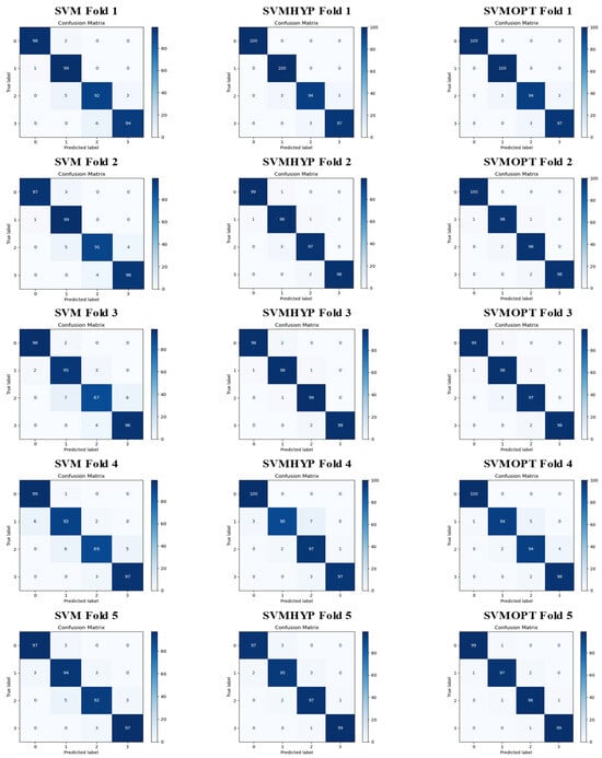 The confusion matrix of predicting result using SVM, SVMHYP, and SVMOPT models across 5-fold cross-validation.