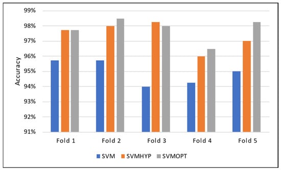 The bar chart compares the accuracy of three SVM models across five cross-validation folds.