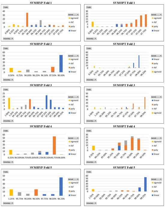 Figure 11 illustrates the distribution of kernel types across accuracy levels, showcasing histograms of accuracy over 100 trials across five folds, using four kernel functions with Optuna and Hyperopt. The results indicate that the highest accuracies are predominantly achieved with the linear and poly kernels, whereas the sigmoid kernel consistently yields the lowest accuracy. This suggests that linear and poly kernels are more suitable for achieving high accuracy during hyperparameter optimization with Optuna and Hyperopt, while the sigmoid kernel is less effective.