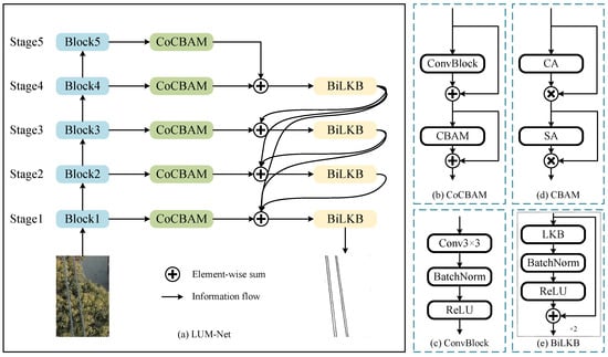 The architecture of (a) LUM-Net, (b) CoCBAM, (c) ConvBlock, (d) CBAM, and (e) BiLKB.