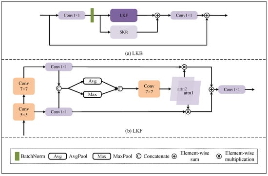The BiLKB module, illustrated in Figure 1e, employs a residual structure that sequentially connects two LKBs with batch normalization layers and a ReLU activation function. This residual design helps mitigate the risk of vanishing gradients, ensuring that deeper layers can still contribute meaningful information to the final feature maps. It also facilitates better gradient flow, enabling more effective training and improved feature extraction across multiple scales.