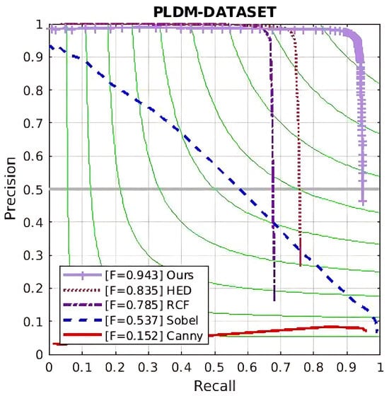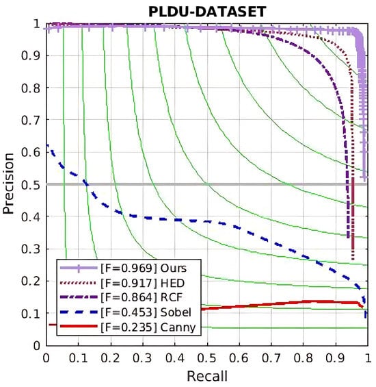 Quantitative comparison on PLDU dataset: On the PLDU dataset, we compared our LUM-Net with traditional edge detection algorithms such as Canny [] and Sobel [], as well as deep learning-based edge detection algorithms like HED [] and RCF []. The quantitative analysis results are shown in Table 2. Our LUM-Net achieved the best performance (ODS = 0.969, OIS = 0.976, AP = 0.965), which significantly surpassed that of the traditional edge detection algorithms. Compared to the deep learning-based algorithms HED and RCF, the LUM-Net’s ODS and OIS values were 5.7% and 4.2% and 12.2% and 11.0% higher, respectively. Figure 3 shows the precision-recall (P-R) curves for evaluating overall algorithm performance. It is evident from the P-R curves that the LUM-Net’s curve is closest to the top-right corner of the P-R graph, indicating optimal performance.