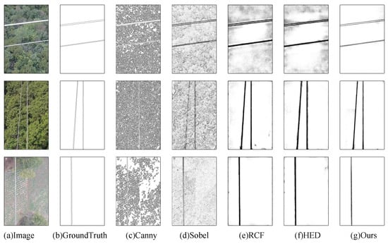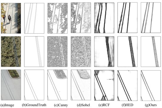Traditional image-based PLD methods primarily rely on low-level local features and the design of operators based on prior gradient-based knowledge, such as Canny [] and Sobel [], to detect edge information. Subsequently, they employ the Hough transform and hand-designed filters to identify local power line elements. Finally, discrete primitives are connected into complete line segments through perceptual grouping. In 2002, to address the issue of detecting thin wires amid image clutter and noise, Kasturi et al. [] proposed an approach that included an algorithm for sub-pixel edge detection suggested by Steger, followed by post-processing to reduce false alarms. In 2007, Yan et al. [] analyzed the characteristics of imaged power lines and introduced an algorithm to extract power lines from aerial images automatically. This method first utilized a Radon transform to extract line segments of the power lines, then employed a grouping method to link each segment, and, finally, applied Kalman filter technology to connect the segments into a complete line. To detect power lines against a cluttered background, Li et al. [] proposed a novel method in 2010 that developed a pulse-coupled neural filter to eliminate background noise and create an edge map before using the Hough transform to detect straight lines. In 2014, Song et al. [] proposed a sequential local-to-global PLD algorithm, which can detect not only straight power lines but also curved ones. The local criterion used morphological filtering to obtain an edge map image, which was computed based on a matched filter and first-order difference of Gaussian. The global criterion grouped the line segments into whole power lines, which was formulated as a graph-cut model based on graph theory.