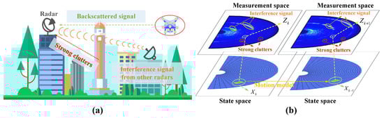In high-resolution cascaded FMCW-MIMO radar systems, there may be multiple spatially distributed measurement sources on the unmanned aerial vehicle (UAV). In each time step, the backscattered signals from different measurement sources will occupy multiple resolution cells of the measurement space, as shown in Figure 1. On this account, the point-target assumption in classical tracking methods, such as particle filter (PF) [], Kalman filter (KF) and its variants [,], will become invalid. Although the spatially distributed measurements can be treated as multiple targets to track by means of data association-based algorithms, such as nearest neighbor data association (NNDA) [], joint probabilistic data association (JPDA) [] and multiple hypothesis tracker (MHT) [], it is difficult to complete accurate measurement-to-source association because the extended measurements highly depend on the properties of the target and the radar-to-object geometry, which often quickly varies with moving targets. Also, the contour tracking algorithm [] is not appropriate for tracking extended UAV either because it is nearly impossible to correctly extract the contour with the sparse and time-varying radar point cloud. In [], to achieve extended target tracking, the center point of the multiple spatially distributed measurements was first extracted by density-based spatial clustering of applications with noise (DBSCAN) and then the classic point tracking method was employed to track the cluster center. Unfortunately, the extended features (e.g., the shapes and sizes) hidden in measurements will be lost in the clustering process. By introducing shape parameters in the target state, the random matrix method (RMM) [,] and random finite set (RFS) approaches [,] can simultaneously track the positions and extensions of a target without considering measurement-to-source association problem. Additionally, the second-order extended Kalman filter (SOEKF) [] and random hypersurface modeling (RHM) [] are two other effective extended target tracking methods. Nevertheless, the tracking performance of these approaches highly depend on the accuracy of detections, which may be easily interfered with by interferences in urban air environments, such as mutual intrusion from other co-channel radars and strong clutter interruption from infrastructures.