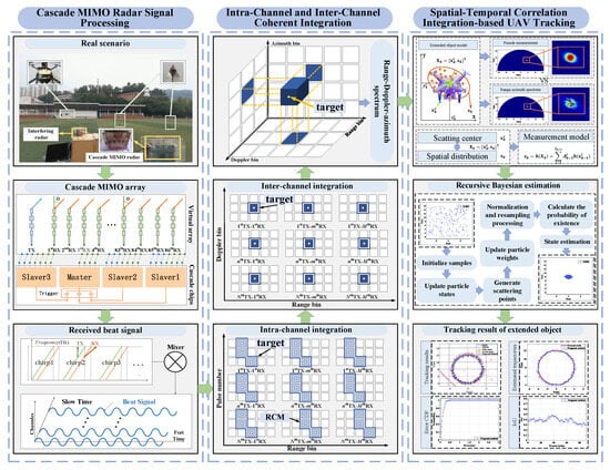 In this article, we aim to provide a continuous and robust tracking framework for low-observable and extended UAV by employing a high-resolution cascade FMCW-MIMO radar subject to interferences from strong clutters and other radars. In this tracking framework, we first convert the uncertainty of the scattering sources into the randomness of ellipse sizes and intensities in spatially extended resolution cells. The benefits are that the complex measurement-to-source association process is removed and the extended UAV can be treated as an entity to track by means of an ellipse-based spatial probability distribution model. On this basis, for dealing with the low-observable UAV tracking problem in the presence of ghost targets generated from strong clutters or mutual interfering radars in urban low-altitude, we formulate and derive an end-to-end spatiotemporal correlation integration (ESCI)-based tracking framework that can simultaneously capture both the uncertainty regarding the object’s existence as well as the uncertainty of the target’s state. It employs the coherent integration algorithm to sufficiently improve the SINR in one radar frame and then presents the recursive Bayesian estimation-based track-before-detection strategy to complete UAV tracking and interference suppression by directly utilizing the unthresholding radar spectrum, which can avoid weak target information loss caused by the conventional threshold-decision process prior to tracking. The main contributions can be summarized as follows.