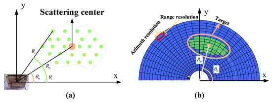Geometry relationship and the extended range–azimuth spectrum. (a) Geometry relationship between radar and extended UAV. (b) Range–azimuth spectrum of extended UAV.