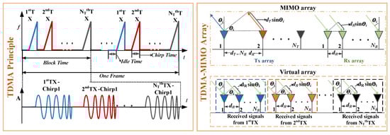 In this article, as shown in Figure 4, with the time division multiple access-MIMO (TDMA-MIMO) strategy [], the signals transmitted from different transmitting elements can be separated, and the presented MIMO array can be synthesized as a virtual MIMO array, where is the total number of virtual antennas. More specifically, in a single time block, the chirp signals from different transmitting antennas are transmitted to the area of interest at different time slots sequentially. At the receiver, the backscattered signal from the -th transmitting element is received at the -th time slot. For the signal transmitted by the -th antenna and received by the -th antenna, the additional propagation path induced by the spacing difference of transmitting and receiving array elements is . Furthermore, by reasonably designing the spacing distances of transmitting arrays (e.g., ), the additional propagation path can be rewritten as , which is equal to the space difference between the first and -th receiving antennas in a array. Hence, the dimensional MIMO array can be restructured as a virtual array. On this condition, the azimuth angle resolution can be increased to , which only needs antennas, far less than .