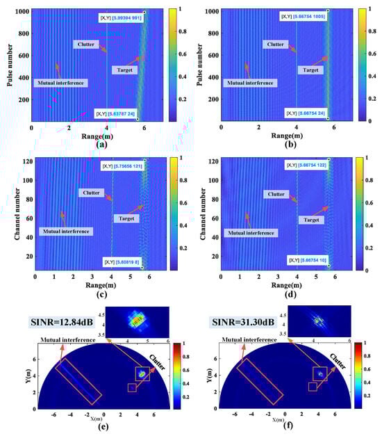 Figure 6 shows the results of the coherent integration of 2D-KT verified using MATLAB R2023a. In this figure, the radar’s mutual interference was added to the returned signals of the target, and another static object was also presented to simulate the strong clutters. The parameters of the radar system were set as follows: the carrier frequency GHz, the bandwidth B = 2.4 GHz, the number of virtual antennas , the pulse duration = 50 s and the chirp rate = 85.021 MHz/s. In addition, the chirp parameters of the jamming radar are GHz, = 45 s, = 85.106 MHz/s. The range of the slow plane of the first RX-TX channel before and after KT are given in Figure 6a,b. In Figure 6a, we can clearly see the RCM that the target power of different pulses distributes at different range cells. After KT, the RCM is corrected and the signal power of different pulses from the same reflection source is located at the same range cell. Then, after performing Fourier transform along the pulse number, a peak which integrates the power of all pulses from the same reflection source of the target will occur in the Doppler spectrum range. Figure 6c,d presents the channel plane range of the first chirp before and after KT. Due to the large number of virtual channels, it can be seen from Figure 6c that the spacing distance differences of the virtual antennas also bring about RCM, which will degrade the target detection and tracking performance. Fortunately, this type of RCM can be also removed after a second KT process, as shown in Figure 6d. In addition, due to the difference in chirp rates between interfering and victim radars, from Figure 6a–c, we can observe that the signal power of radar mutual interference distributes at different range cells after KT, which will decrease the final signal power of interference and thus is beneficial to target detection and tracking. The final azimuth spectrum range before and after 2D-KT are depicted in Figure 6e,f. We can observe that, after 2D-KT, the SINR is coherently integrated from 12.84 dB to 31.3 dB, which can effectively improve the low-observable UAV detection and tracking performance.