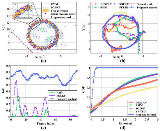 Based on the coherent integration results of 2D-KT in Figure 6, the tracking results of the MATLAB R2023a-implemented ESCI-based framework are presented in Figure 7. In this figure, the flying trajectory of UAV was set as the closed circular loop, as given in Figure 7a. It can be seen that most of the target measurements can be obtained after a threshold-decision process. However, the ghost measurements induced by co-channel radar interferences and static clutters can also be clearly seen in Figure 7a, which causes wrong target-to-measurement association. On this account, the tracking results of RMM, SOEKF and DBSCAN deteriorate seriously. As shown in Figure 7b, although particle filter track-before-detect (PFTBD) also utilizes the non-thresholding spectra, the mismatch of the point-source model decreases the tracking precision of the extended UAV. By maximizing the posterior probability in a sequence of consecutive radar range–Doppler–azimuth spectra, the proposed method can track the object which satisfies Newtonian dynamic equations and elliptic energy distribution in the presence of radar mutual interferences and strong clutters. As a result, the proposed method can accurately track the low-observable extended UAV. Figure 7c,d present the intersection over union (IoU) between the tracked shape and the true extension and error cumulative distribution functions (CDFs) of the estimated trajectory. We can observe that all estimated IoUs are larger than 0.5 and the errors of the estimated trajectory are within 0.5 m, which means that the proposed method can simultaneously track the shape parameters and kinematic variables of UAV precisely in the presence of radar mutual interferences and strong clutter.
