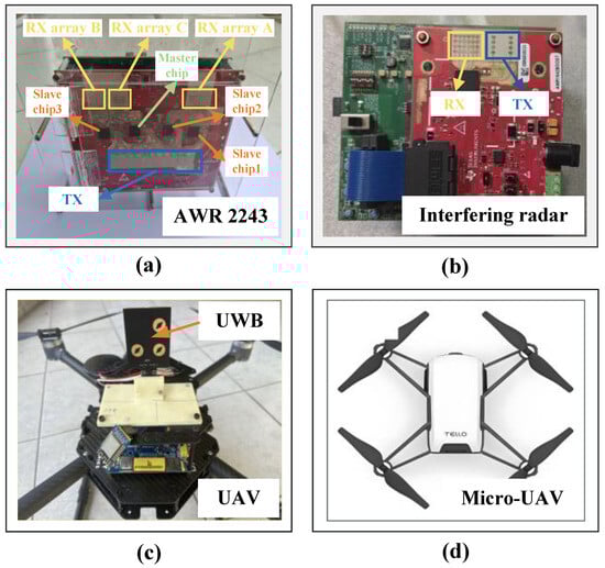 In this section, we verify the tracking effectiveness of the proposed method for low-observable and extended UAV in four different scenarios, including a mutual interference scenario, strong clutter scenario, mixed interferences scenario and rainy scenario. In these experiments, as shown in Figure 8a, a low-cost, high-resolution cascade MIMO radar with four AWR2243 chips was presented to track the flying UAV. In this cascaded radar system, as shown in Figure 8a, with a local-oscillator (LO) signal distributed among all four devices by a single master device, the transmitting and receiving microstrip patch array antennas from different devices can be regarded as an integrated transceiver supporting up to 9 TX and 16 RX antenna elements in azimuth. Meanwhile, the interfering radar presented in our experiments is TI AWR 1642, as shown in Figure 8b. Generally, since the incoherent radar interference that interfering and victim radars have different chirp parameters occurs in most cases and always results in severe performance loss for extended UAV tracking [,], we mainly concentrate on incoherent radar interference in this article and the configured parameters of interfering and victim radars are presented in Table 1. It should be pointed out that the dechirp technique [] is employed in our radar, and thus, the sample rate is significantly smaller than the bandwidth. Figure 8c shows the developed UAV, which was embedded in a high-precision ultra-wideband (UWB) positioning module to obtain the flying trajectories as the ground truth for comparison. In addition, as given in Figure 8d, the DJI Tello Micro-UAV was also employed as the target in a rainy scenario. Three classical extended target tracking methods, i.e., DBSCAN [], RMM [,], SOEKF [], and the point-target tracking method, i.e., PFTBD [], are also given for comparison.