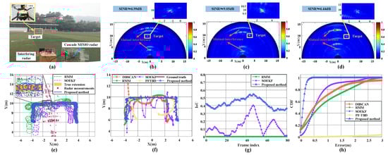 For further verifying the effectiveness of the proposed method, we also conduct an experiment in the presence of mutual interference and strong clutters simultaneously. In this scenario, as given in Figure 11a, the UAV was also controlled to fly with a rectangle trajectory that the start/end position coordinate was (−4, 4). The experimental scene and radar raw spectra are presented in Figure 11b–d. The random speckles from the interfering radar and the fixed strong clutters can be clearly seen in radar raw spectra of these images. The tracking results of different methods are presented in Figure 11e–h. It can be seen from Figure 11e,f that RMM, SOEKF, DBSCAN and PFTBD completely obtain wrong trajectories under the mixed interference scenario. Figure 11g depicts the estimated IoUs of RMM, SOEKF and the proposed method, and Figure 11h presents the error CDFs of estimated trajectoies by different methods. It can be seen that the IoUs of RMM and SOEKF are near zero in the whole tracking process, which means that the tracked shape of these two methods have few overlaps with the true extension. We can also notice that in Figure 11g, because the target signals were nearly submerged by interferences around the 28th and 56th frames, the tracking performance of the proposed method decreases quickly around these frames. Fortunately, by deriving an ESCI-based tracking framework, which employs the recursive Bayesian estimation-based track-before-detection strategy to complete UAV tracking and interference suppression by directly utilizing the non-thresholding radar spectra, the positioning errors of the proposed method are within 0.5 m and most IoUs are larger than 0.4. Hence, the proposed method can obtain better tracking performance than RMM, SOEKF, DBSCAN and PFTBD in the presence of ghost targets generated from strong clutters or mutual interfering radars in urban low-altitude.