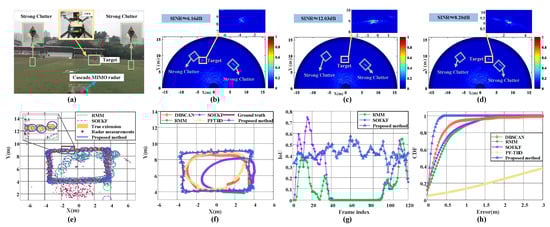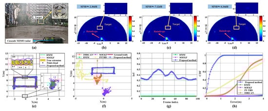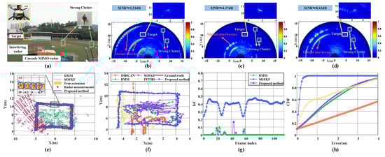 Robust tracking of UAVs is a fundamental capability for modern radar systems under adverse weather conditions. As a result, we conducted a rainy experiment, where the DJI Tello micro-UAV, which has extremely low RCS, was controlled to fly a rectangle trajectory in the front of our cascade MIMO radar under rainy conditions (in radar echoes, dense precipitation particles will generate dynamic distributed clutter, resulting in attenuation of the target signal), as illustrated in Figure 12a. The start/end position of the DJI Tello micro-UAV was (−2, 6). The range–azimuth spectra of radar echoes at different radar frames are also presented in Figure 12b–d. We can observe that the signal power of the DJI Tello micro-UAV is quite weak, where the UAV is nearly submerged by noises and rain clutter. Additionally, we can also notice that the signal power of raindrops around radar is much stronger than the DJI Tello micro-UAV, and the SINRs in these three frames are all lower than 0 dB, which will cause serious mis-detections and false alarms after a threshold-decision process, as shown in Figure 12e. Since the RMM and the SOEKF highly depend on the radar measurements, they wrongly tracked the rain clutters, as illustrated in this figure. Fortunately, by jointly employing the spatiotemporal correlation information of the target existing in a sequence of radar raw spectra, the proposed method can accurately track the DJI Tello micro-UAV. As shown in Figure 12g, the IoUs of RMM and SOEKF approach zero, but our method is 0.4. The trajectory tracking results and the corresponding error CDF are given in Figure 12f,h. We can see that more than 80% of tracking errors of the proposed method are within 0.6 m, which is much better than other SOTA algorithms. Accordingly, compared with SOTA algorithms, the proposed method can robustly achieve low-observable and extended UAV tracking in the presence of rain clutter.