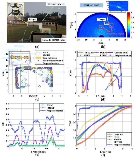 Tracking results of extended UAV in occlusion scene. (a) Experimental scene. (b) Radar raw spectrum. (c) Tracking results. (d) Estimated trajectories. (e) IoU between the tracked shape and the true extension. (f) Error CDF of estimated trajectory.