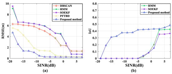 Tracking performance of extended UAV under different SINRs. (a) Tracking RMSEs with SINR increasing. (b) Estimated IoUs with SINR increasing.