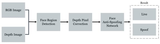 We propose a method for preventing face spoofing. The proposed model is trained using domain adversarial learning to ensure robust performance across multiple domains. The flow of the proposed method is shown in Figure 1. First, a face is captured as RGB and depth images. A facial region is detected from the RGB image using a pre-trained face segmentation model. Afterward, the depth image is corrected. Finally, both the depth image and RGB image are fed into the face anti-spoofing network to determine whether the given face image is a real or spoofed face.