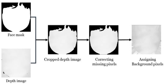 The depth image pixel correction process consists of three steps, as illustrated in Figure 6. The depth image and the previously extracted facial mask are used as inputs, where the depth values are assigned to the facial region based on the mask. The subsequent steps involve correcting both the facial region and background pixels.