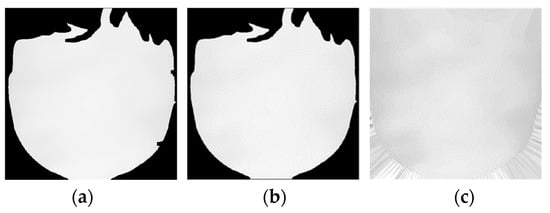 Figure 7a shows an image where the input depth values have been assigned to the facial region based on the mask. Although the mask was refined using morphological erosion, some pixels within the facial region are missing due to the inherent limitations of the depth camera. Since adjacent pixels in the depth image often have similar values, a 5 × 5 mode filter is applied to correct these missing pixels. Figure 7b illustrates this correction as applied to Figure 7a. Afterward, background pixels are assigned specific values to minimize the influence of their background during network training. Since the depth values are only applied to the facial region using the extracted mask, all background pixels in the current depth image are set to zero. Additionally, since the facial region pixels have already been corrected, any remaining missing pixels represent the background. To further refine the image, background pixels are filled with the depth value of the nearest facial region pixel. Figure 7c illustrates the final result, where the background pixels in (b) have been filled. This process ensures that all missing pixels in the depth image are properly assigned. By filling the background with depth values derived from the facial region rather than arbitrary values or empty spaces, the network can better emphasize the facial region during training [30,31].