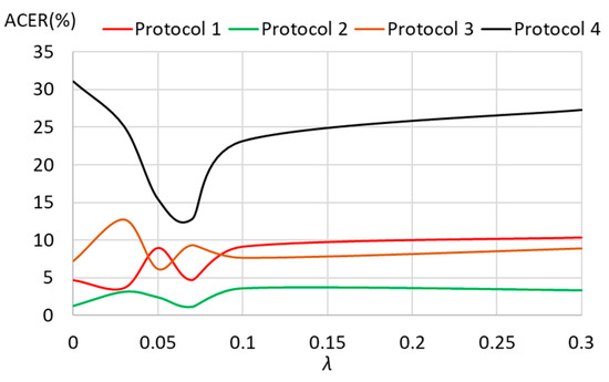 Table 5 shows that the networks trained using domain adversarial learning achieved a lower ACER than those trained without it. In Protocol 1 (lighting variation dataset), the lowest ACER (3.68%) was achieved with a weight of 0.03, indicating the best performance. The next lowest ACER (4.72%) was obtained with a weight of 0.07. In contrast, with a weight of 0.5, the ACER reached 15.1%, making it the worst performing configuration, with a 10.38 percentage point increase compared to the non-adversarial trained network. For Protocol 2 (attack-type variation dataset), the lowest ACER (1.18%) was obtained with a weight of 0.07. The ACERs generally remained within the 4% range, with the highest ACER (3.7%) occurring at a weight of 0.5. Similar to Protocol 1, performance degradation was observed at 0.5, but the difference among weight values was less pronounced. This indicates that the proposed network maintains high spoof detection performance even when attack types vary. For Protocol 3 (camera-type variation dataset), the best ACER (6.14%) was obtained with a weight of 0.05. However, weights of 0.03 and 0.5 resulted in significantly higher ACERs of 12.73% and 10.25%, respectively. In Protocol 4 (lighting, camera, and attack-type variation dataset), the performance significantly decreased across all weight values. The best ACER (12.75%) was achieved with a weight of 0.07, showing a 18.31 percentage point improvement compared to the non-adversarial trained network (ACER = 31.06%). Even the worst performing adversarial trained network, with a weight of 0.3, had an ACER of 27.28%, which was still 3.78 percentage points lower than the non-adversarial trained network, indicating better performance. However, excessive or insufficient weighting led to unstable training and degraded performance, sometimes even resulting in worse performance than the non-adversarial trained network. This was particularly observed when the weight value was 0.3 or 0.5 (too large) or 0.03 (too small). Therefore, identifying an appropriate weight value through experimentation was necessary. In this study, 0.07 was selected as the optimal weight. Although the ACER for Protocol 3 was higher than that of the non-adversarial trained network when using adversarial learning, this method showed better performance in other protocols, particularly achieving the greatest improvement in Protocol 4. These results demonstrate that domain adversarial learning enables the face anti-spoofing. Figure 12 shows the ACER curves with respect to λ. In most protocols, the optimal performance was achieved when λ was set to 0.07.