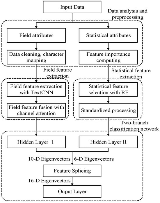 Dual-branch network with specialized feature treatment. Additionally, we designed a multi-layer network classification model with a branch structure to train the field feature vector and statistical feature vector, balancing the contributions of field features and statistical features to the training of the detection model. Unlike traditional single-path structures, this model independently processes semantic and statistical features through two separate branches for enhanced detection accuracy and generalization.