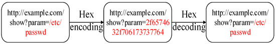 Decoding. Some attackers disguise attack codes by encoding them [25], converting their string forms to hide their original semantic information, which hinders model learning and training. Common encoding methods in request packets include Base64 encoding, URL encoding, and Hex encoding. This cleaning decodes the encoded content based on whether the field is encoded using the above methods to obtain the original text of the field. As shown in Figure 2, after decoding the URL parameter, 2f6574632f706173737764 is replaced with /etc/passwd, revealing the appearance of a Local File Inclusion (LFI) attack.